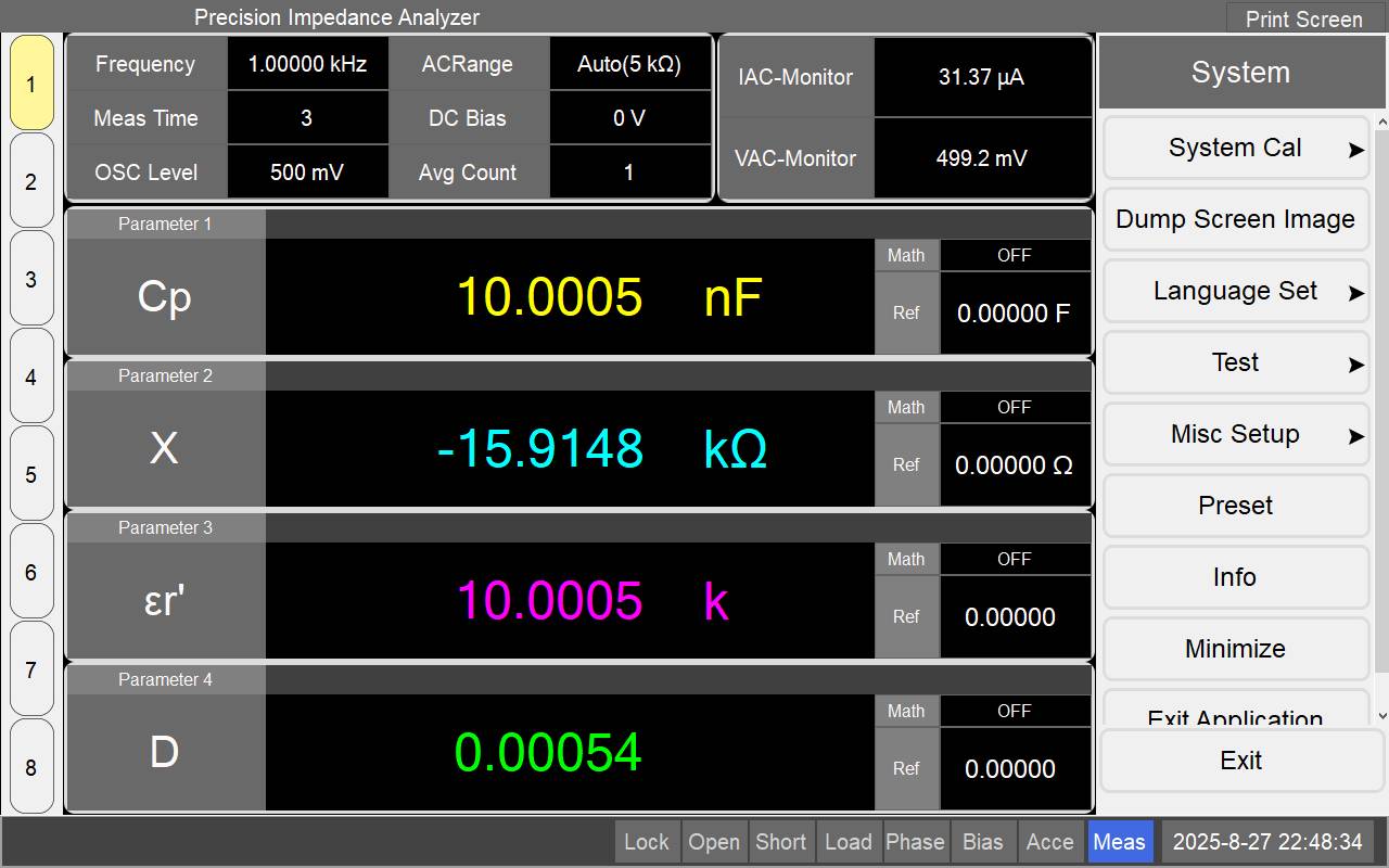 - Test parameters: Cp/s, Lp/s, Rp/s, |Z|, |Y|, R, X, G, B, D, Q, θ, Vac-Iac, DCR, Vdc-Idc